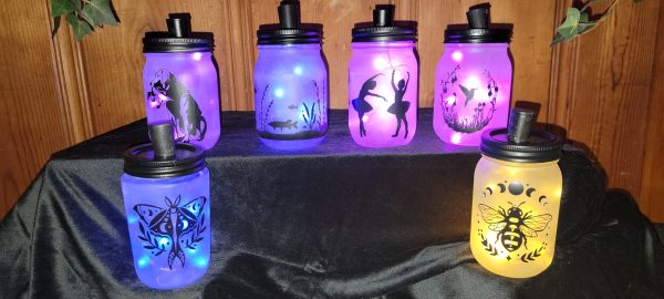 16 oz jars sandblast etched with vinyl decals. The color of the jars are the lights that come with them. Colors of the lights can be changed to one’s that you prefer